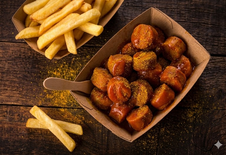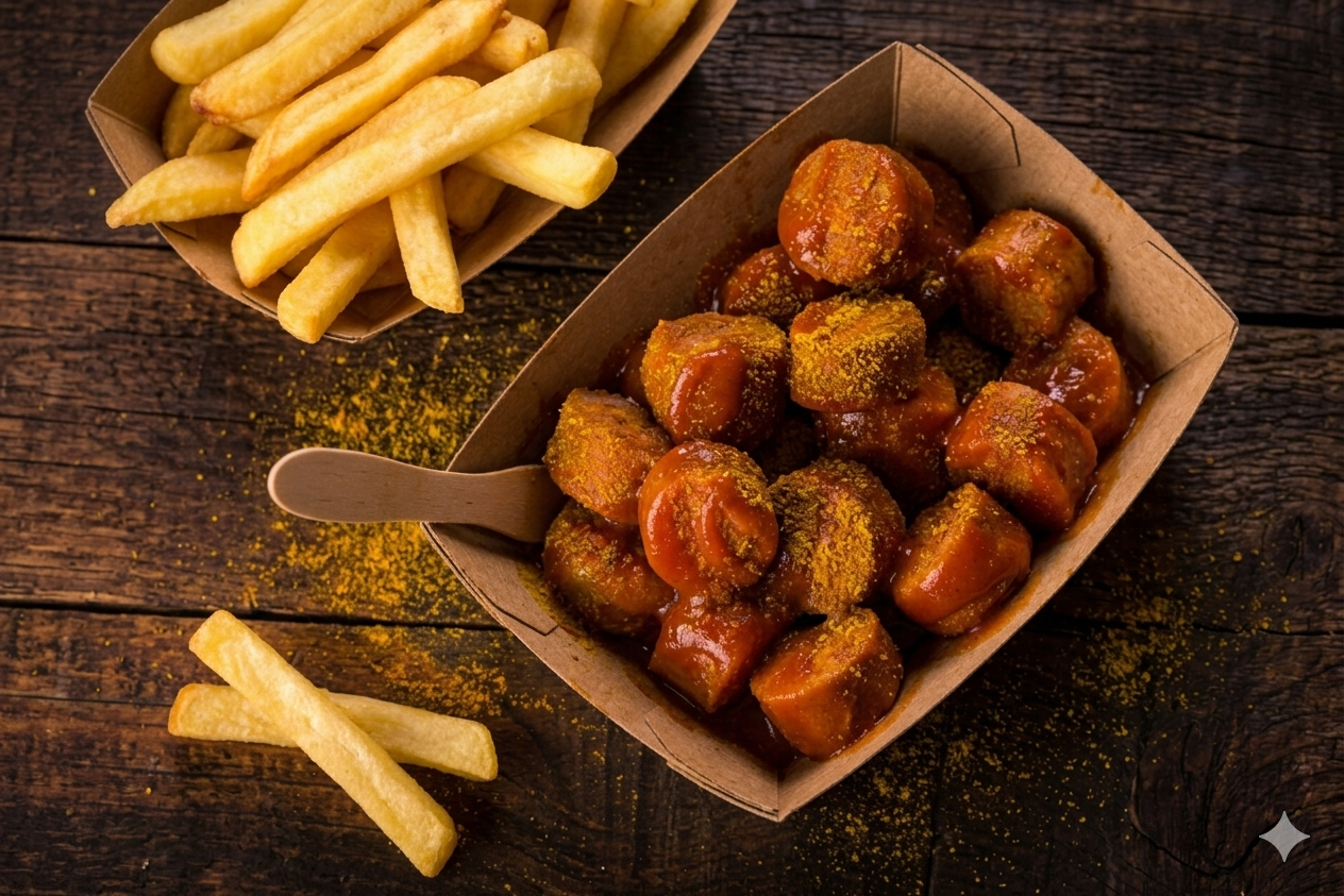 Klassische Bratwurst vom Grill oder Currywurst mit krossen Pommes.
