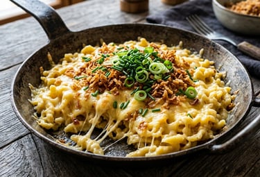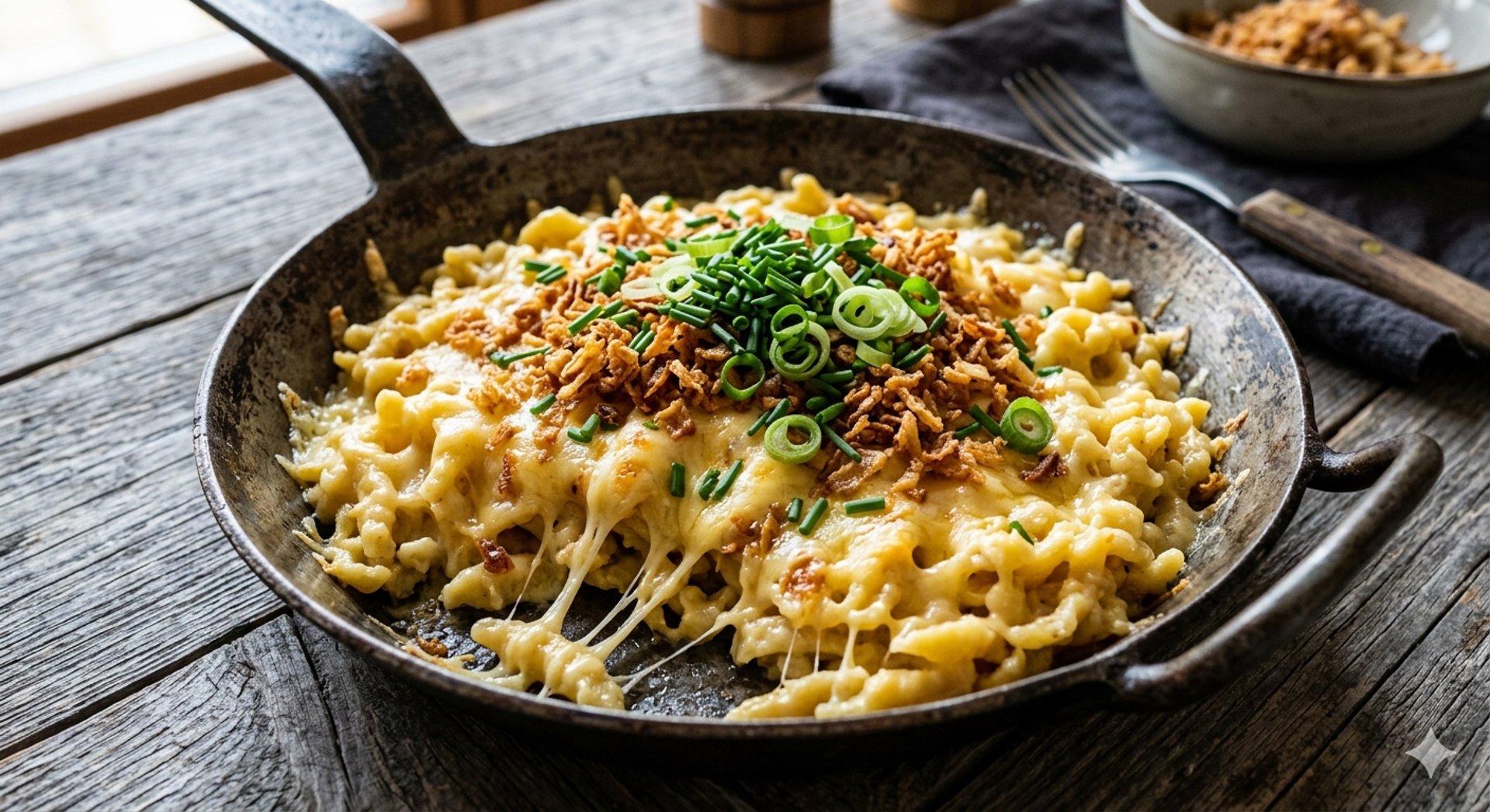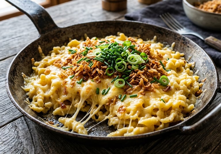 Kässpätzle, mit schweizer Käse und Röstzwiebeln und andere regionale Produkte